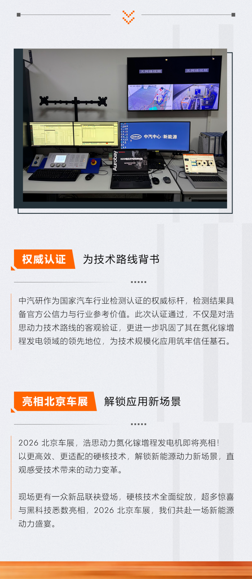 浩思动力氮化镓增程发电系统通过中汽研权威认证,电机控制器效率99.79%,系统效率96.57%,将于2026北京车展全球首秀。此次认证是行业对浩思动力技术的高度认可。