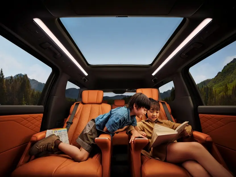 “五恒”座舱之上,至境世家还将健康守护延伸至视觉、触觉以及电磁辐射等多个维度,携手全球生态合作伙伴,共同定义座舱健康新规范。至境世家搭载行业首个南德TÜV护眼认证智慧顶灯,1.1米的贯穿式灯带集成阅读灯和氛围灯功能,支持分段照明,可三级调节色温与亮度,还可一键切换“客厅”、“书房”、“卧室”三种主题光效,精准匹配休憩、阅读或睡眠等不同场景。更重要的是,智慧顶灯无蓝光危害和频闪,即使在灯下长时间阅读或使用电子产品,眼睛也不会酸涩疲劳,实现全场景的护眼健康。视觉健康的关怀同样体现在座舱内的屏幕上。至境世家首次搭载的三屏贯通式娱乐屏(含10.25吋仪表、16.3吋中控屏及16.3吋副驾屏),以及21英寸4K高清后舱智慧屏,均获得莱茵TÜV护眼认证。这些屏幕不仅画面显示细腻鲜亮,更能有效过滤有害光,显著缓解因长时间观看而产生的眩目与光刺激症状。即使是对光线敏感的孩子长时间观看,也能最大限度地减少眼部疲劳和不适。