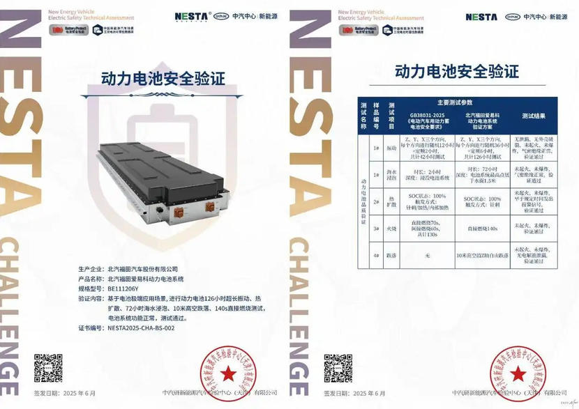 福田汽车自主研发的爱易科动力电池,具备了高安全性、长续航、高效能和场景适配性强等特点,以全优成绩通过五项极端应用场景测试,并获得国家权威机构中国汽车技术研究中心颁发的动力电池安全NESTA验证证书,爱易科也成为了国内第一个通过中汽研动力电池安全NESTA验证的商用车动力电池品牌。