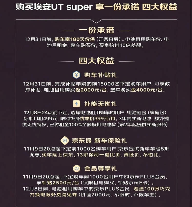 言归正传,此次的新车名叫埃安UT super,它和广汽的埃安UT唯一的区别就是,京东的这款埃安UT有和蔚来相同的换电模式,从某种意义上来说,这款车可以视为埃安UT的换电版本,所以它也有租电池的价格—4.99万元起,整车的购买价格为8.99万元,叠加补贴后最低价为8.59万元。另外还有限时赠送的科技配置包,其功能包含有电尾门、热泵空调、蓝牙钥匙等配置。