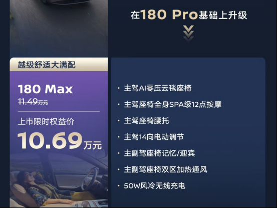 综上,我们最推荐180 Max,180 Max在仅比180 Pro贵5000元的基础上,多了前排座椅通风加热按摩、前排座椅记忆/迎宾、50W手机无线充、外后视镜电动折叠和加热等配置,并且还多了主驾AI零压云毯座椅这个“核心出装”,个人觉得这个钱加得非常值,完全超出这个价位段的乘坐体验。