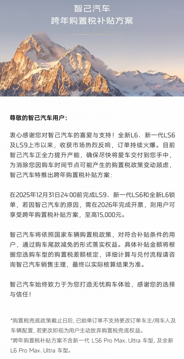 智己还公布了跨年购置税补贴方案,最高可享受补贴15000元。